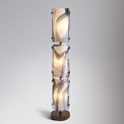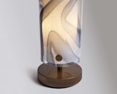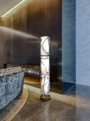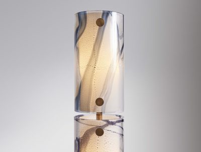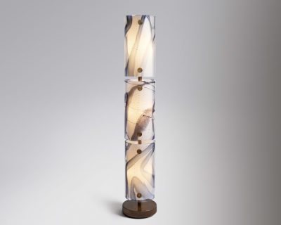 Fabricated in Murano, Italy by storied glassblower Seguso, Nur is a beacon of light, comprised of three cylinders of Venetian bigolo glass with silver leaf and a plexiglass liner, hung on a bronze base.