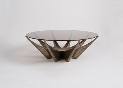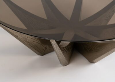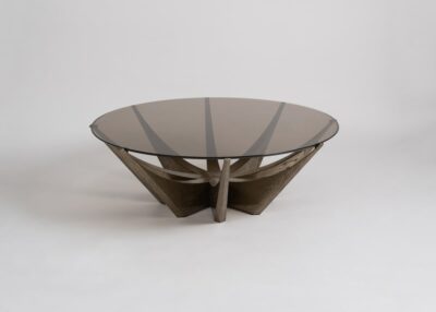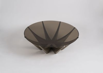 Created specifically to match his distinctive Whalebone sofa, this table by Georgis & Mirgorodsky features a carefully hand-beveled bronze glass top which rests on a joined pattern of eight legs. Arranged in an ebullient starburst pattern, the legs are topped with a dark bronze detail where each meets the glass top.